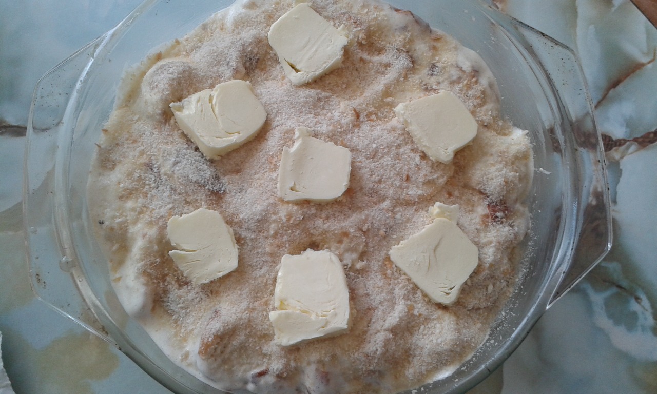 4. Nakoniec poukladáme na vrch plátky masla a necháme piecť na 180° 20-25 minút. Už upečenú žemľovku