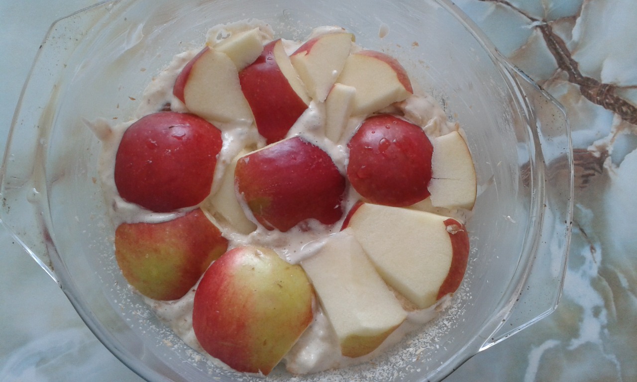 3. Jánske sklo si vymažeme maslom a vysypeme strúhankou. Potom vylejeme pólku žemľovkového cesta do jánskeho skla a poukladáme naň ovocie (jablká, marhule). Ovocie zalejeme druhou polovicou cesta a zase posypeme strúhankou.